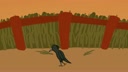 A crow and scarecrow get into a scuffle over corn.