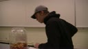 A silent film of a student waiting impatiently for his ramen to be cooked in the microwave.